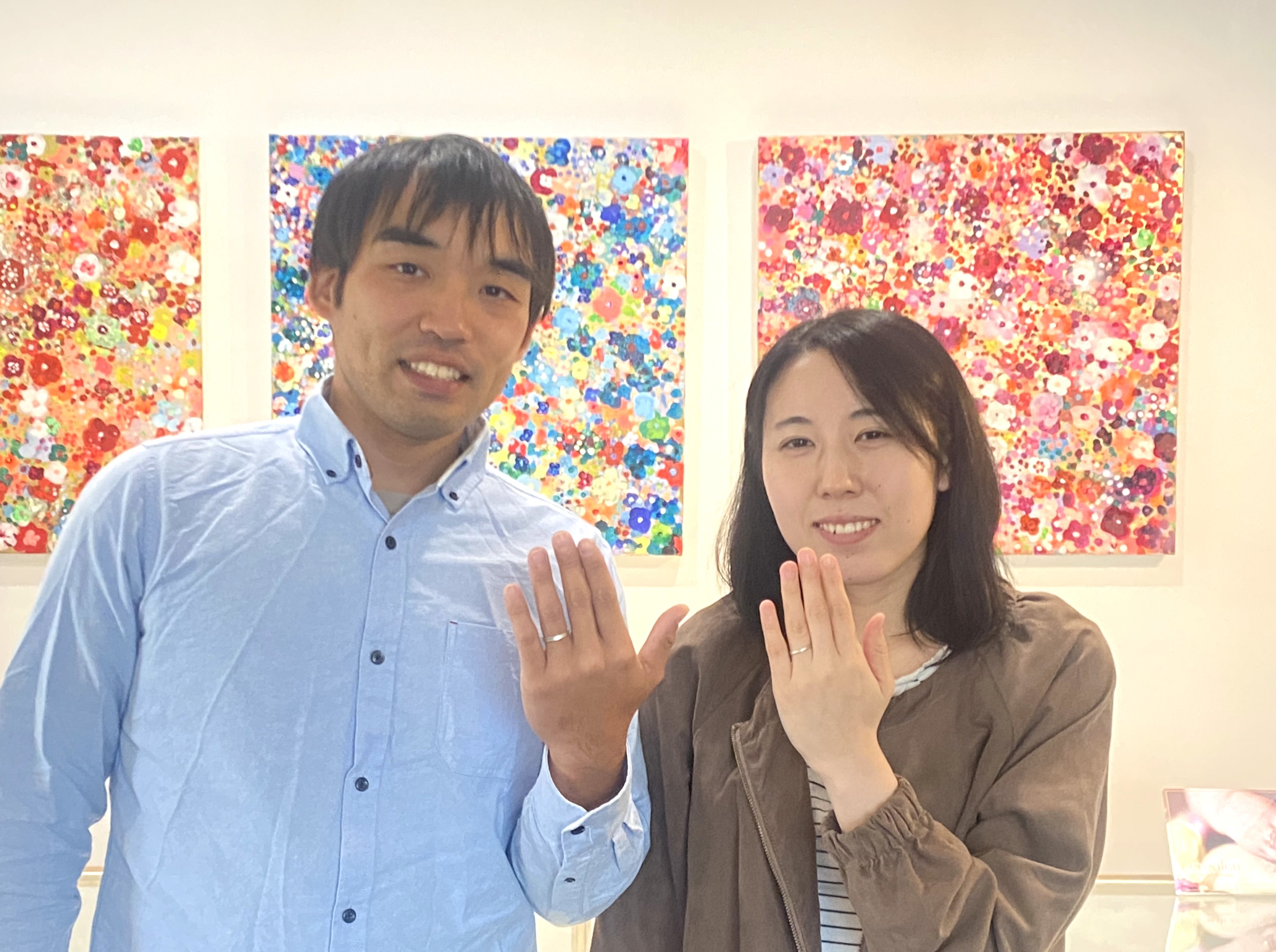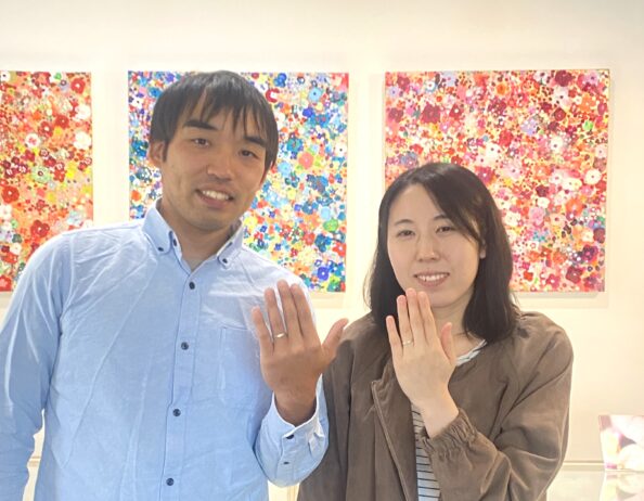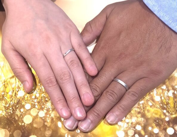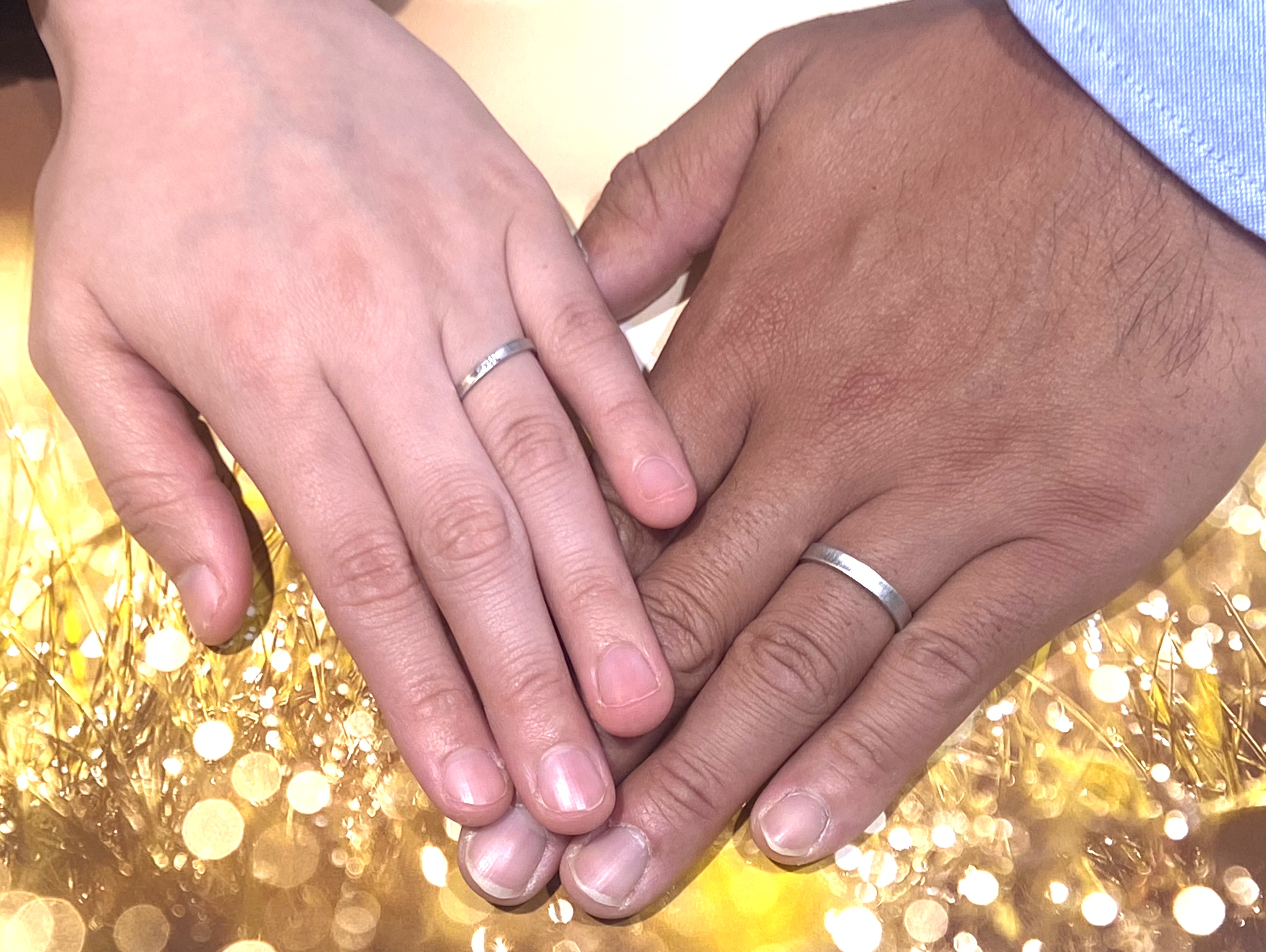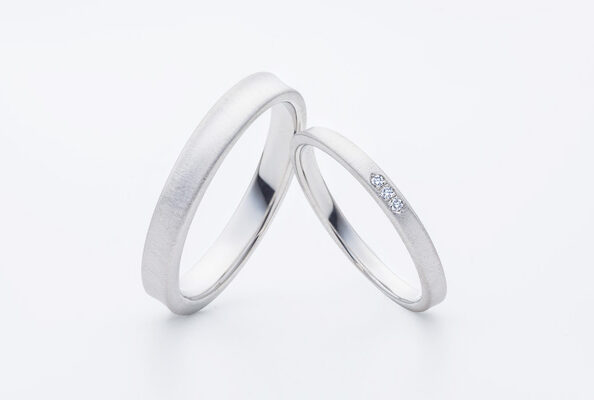 岩手県北上市からご来店を頂きました。 プラチナの結婚指輪です。 お二人の指輪ともにストレートの形に曲面が特徴的なデザイン。全体がマットな質感があり優しく落ち着いた印象。 奥様の指輪表面にはダイヤモンドを3石お付けすることにより輝きのあるエレガントな仕上がりになっています。 指輪のデザインと素材をメンズレディースと揃えることで、きちんとしたペア感がでています。